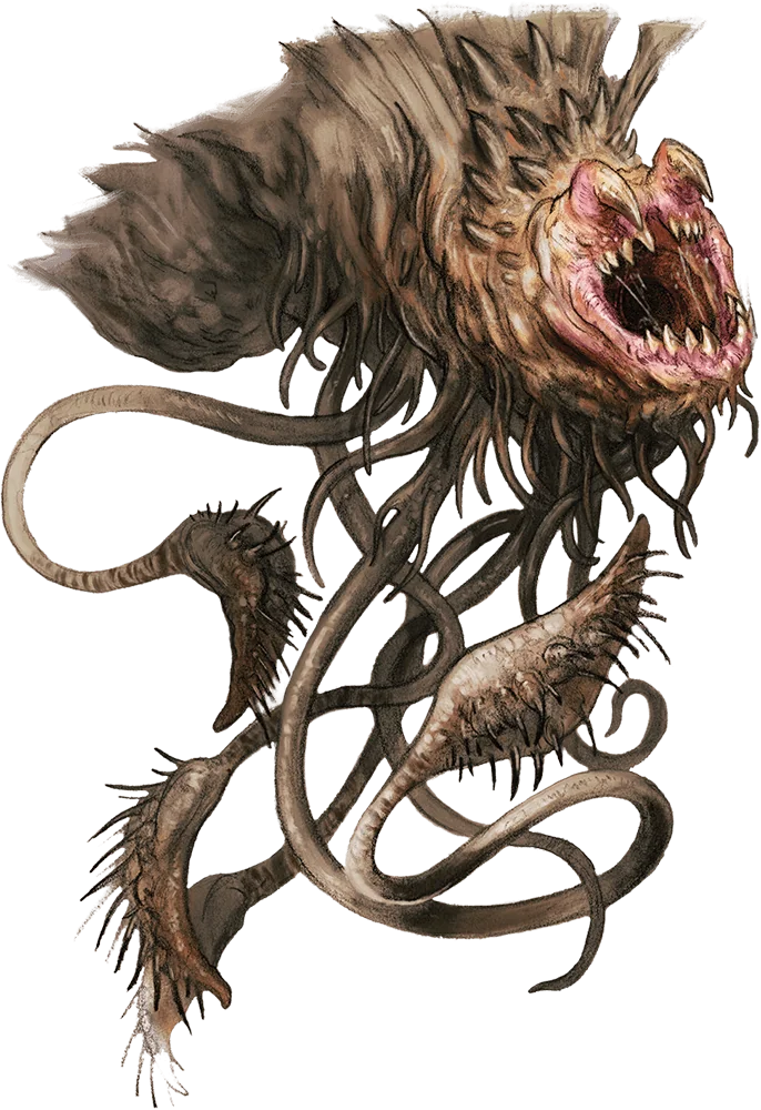 Native to the Shadowfell, the vicious, predatory balhannoth alters reality in its lair to make the place appear inviting to travelers. A limited form of telepathy enables a balhannoth to identify images of places where its prey expects their needs and desires to be met, such as an inn or a temple offering healing. It then warps reality around itself, hiding itself and remaking its environment to resemble such a place. The imitation is imperfect, but it’s good enough to fool greedy or desperate creatures. Once its prey enters the trap, it snatches the targets and teleports away to feed on their fear and despair.