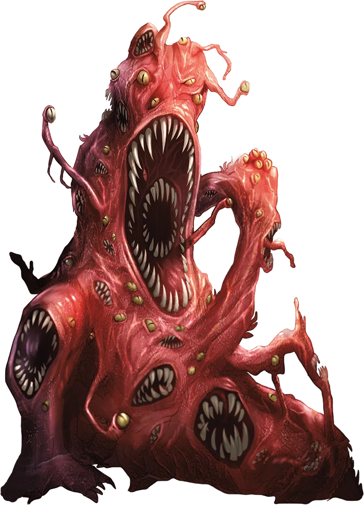 The gibbering mouther’s body is an amorphous mass of mouths and eyes that propels itself by oozing forward, fastening several mouths to the ground and pulling its bulk behind. Though it moves slowly, it swims through water, mud, and quicksand with ease.