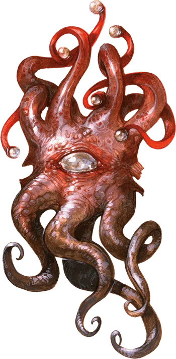 If a beholder is stunned and brought to the brine pool of an elder brain, the beholder can be converted into a mindwitness. This alters some of its eye rays and transforms four of its eyestalks into tentacles similar to a mind flayer’s. The mindwitness is psychically imprinted with devotion to the elder brain and submission to illithid commands.