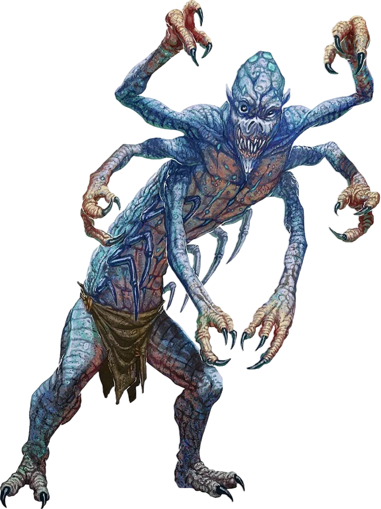A mangler is a low-slung, creeping horror with multiple gangly arms—it most often has six arms but can have any number from four to eight. Manglers creep along the ground or the walls, sticking to shadows and hiding in spots that seem too shallow or well-lit to conceal anything. They appear smaller than their true size, thanks to their hunched posture and emaciated frames. Cultists summon these creatures to serve as guards and assassins, two roles at which they excel.
