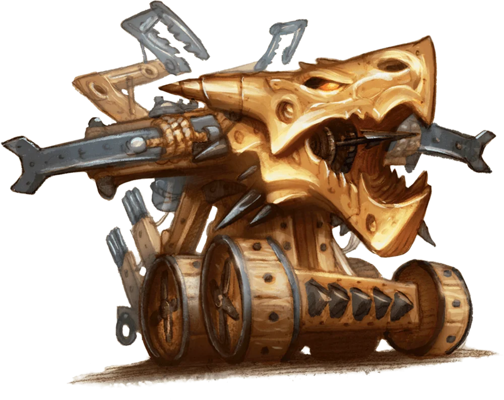 No ordinary ballista, an oaken bolter is a Construct capable of striking at long distances. The bolts it launches can rend flesh, destroy armor, or drag enemies toward traps or melee-oriented clockworks—and at shorter ranges, burst with explosive force.