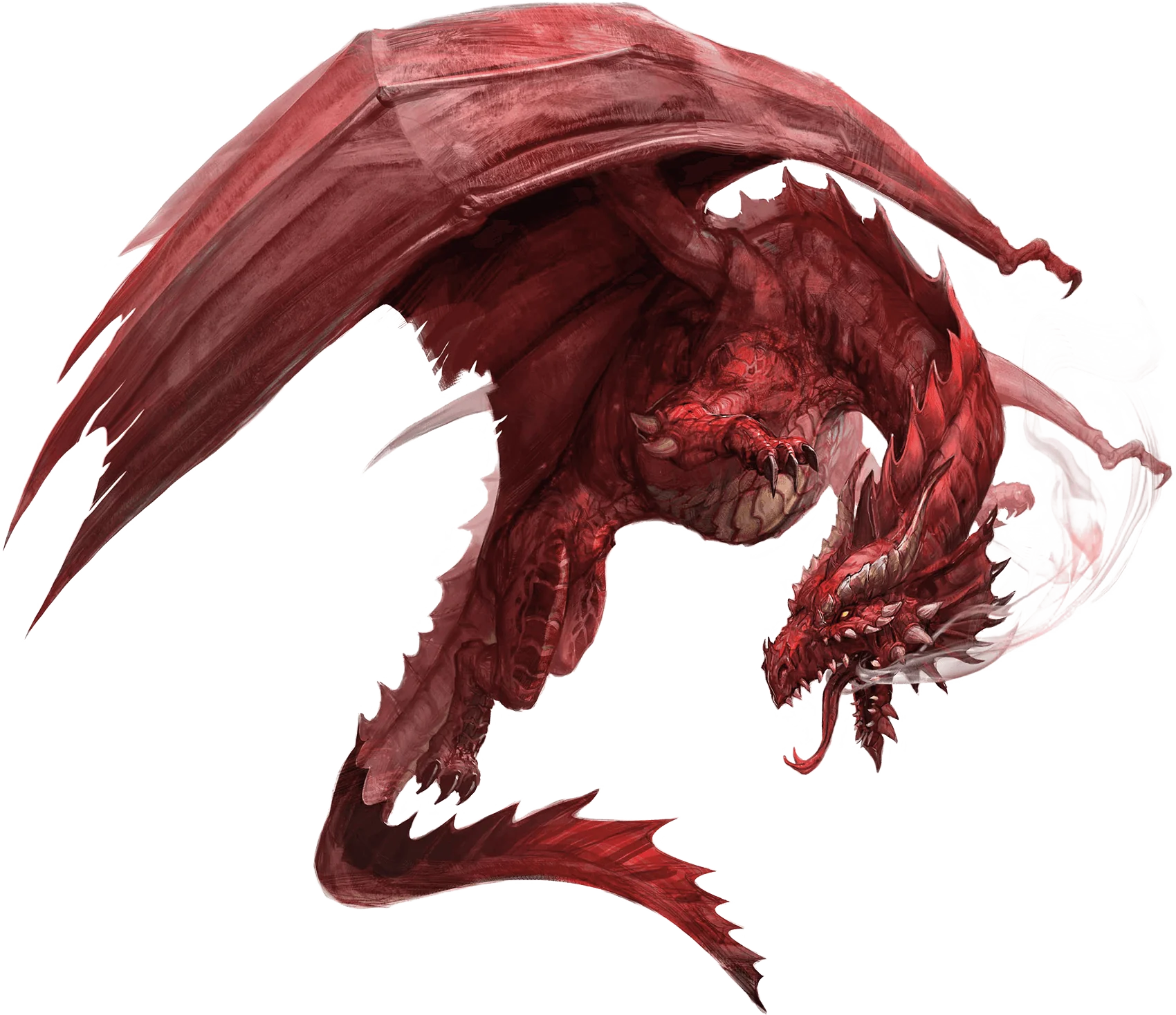 The most covetous of the true dragons, red dragons tirelessly seek to increase their treasure hoards. They are exceptionally vain, even for dragons, and their conceit is reflected in their proud bearing and their disdain for other creatures. The odor of sulfur and pumice surrounds a red dragon, whose swept-back horns and spinal frill define its silhouette. Its beaked snout vents smoke at all times, and its eyes dance with flame when it is angry. Its wings are the longest of any chromatic dragon, and have a blue-black tint along the trailing edge that resembles metal burned blue by fire.