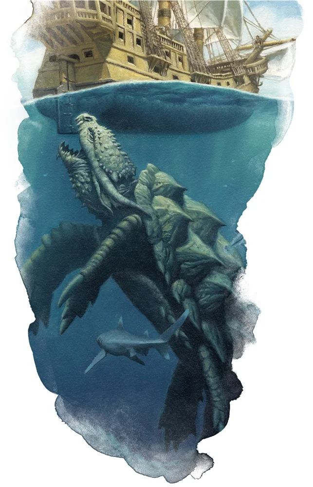 Dragon turtles are among the most fearsome creatures of the oceans. As large and voracious as the oldest of its land-based dragon kin, a dragon turtle strikes with its deadly jaws, steaming breath, and crushing tail.