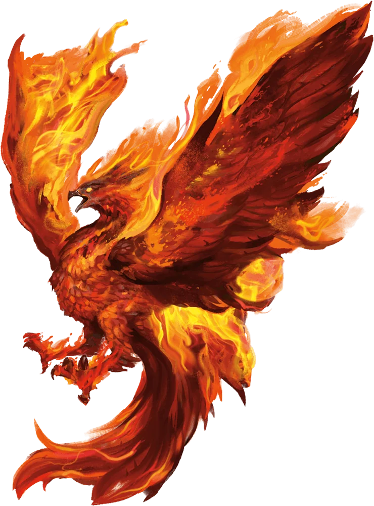 Releasing a phoenix from the Inner Planes creates an explosion of fire that spreads across the sky. An enormous fiery bird forms in the center of the flames and smoke—an elder Elemental possessed by a need to burn everything to ash. The phoenix rarely stays in one place for long as it strives to transform the world into an inferno.