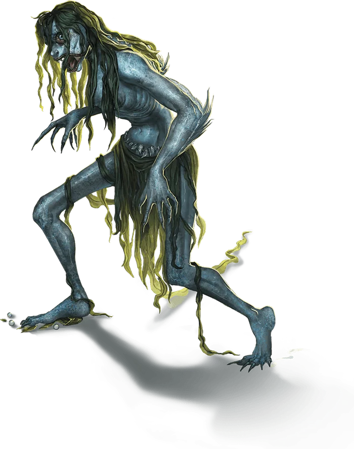 Sea hags are by far the ugliest of all hags, with slimy scales covering their pallid skin. A sea hag’s hair resembles seaweed and covers her emaciated body, and her glassy eyes seem as lifeless as a doll’s. Although a sea hag can hide her true form under a veil of illusion, the hag is cursed to forever appear ugly. Her illusory form appears haggard at best.