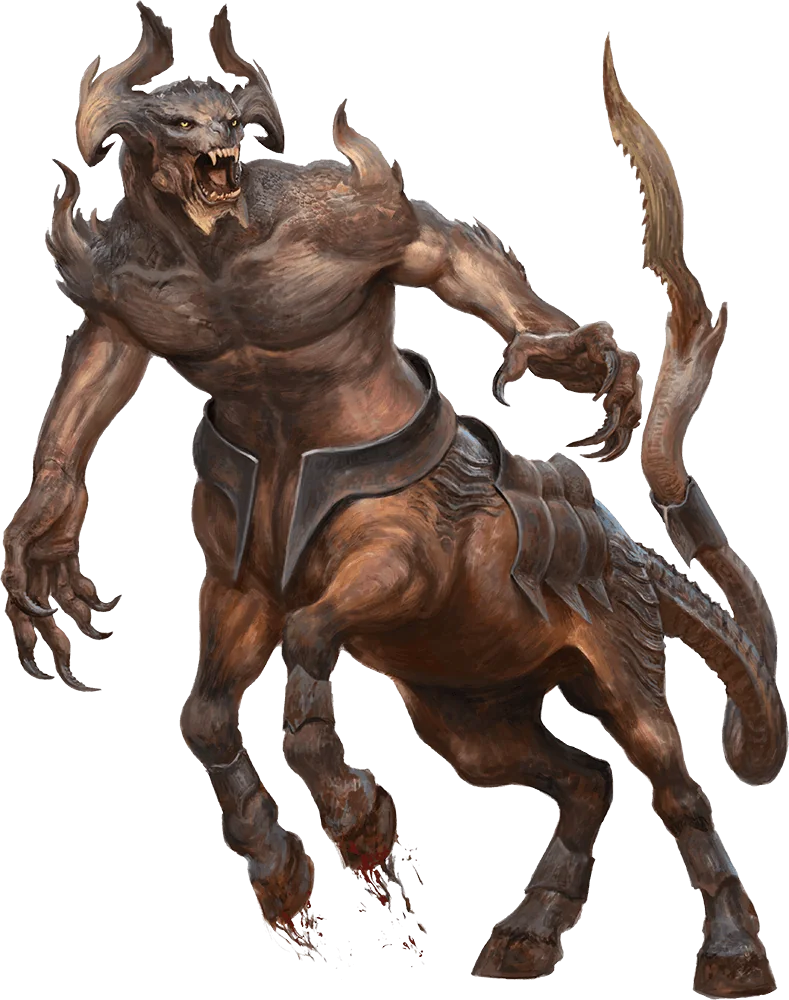 Part of what makes armanites so fearsome is the number of weapons they have at their disposal. They possess dense hooves, claws that end in curling talons, and long tails whose serrated ridges can flense the flesh from a victim, and they use them all to carve through their foes. When they’re up against tough formations, they can call on their innate magic to loose bolts of lightning and blow holes in enemy ranks.