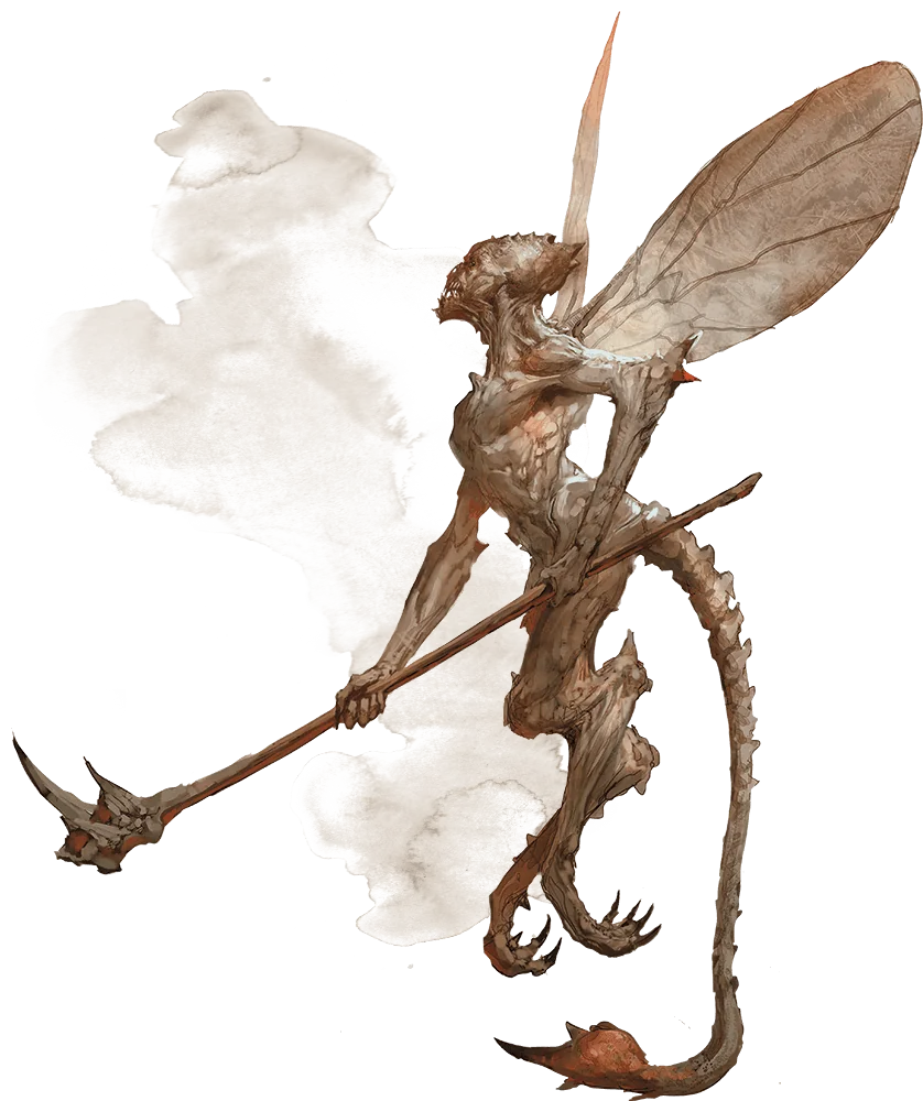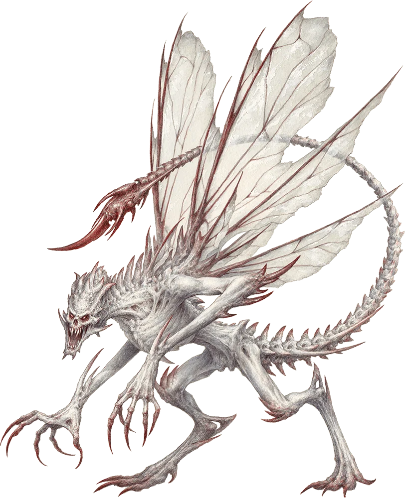 Driven by hate, lust, and envy, bone devils act as the cruel taskmasters of the Nine Hells. They set weaker devils to work, taking special delight in seeing fiends that defy them demoted. At the same time, they long for promotion and are bitterly envious of their superiors, attempting to curry favor though it irks them to do so.