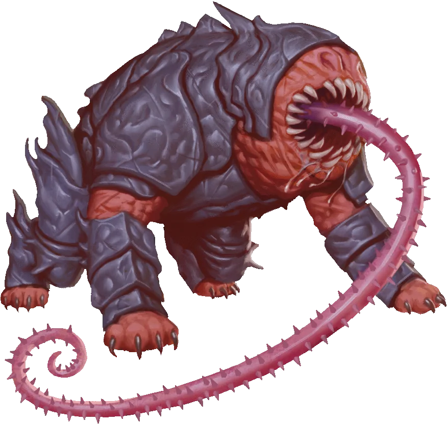 With senses sharp enough to pinpoint the locations of nearby invisible creatures, canoloths respond unfailingly to any threat to their charges. Furthermore, they emit a magical distortion field that prevents creatures close to them from teleporting. Canoloths confront intruders with swift and terrible force, projecting long, spiny tongues to grab their foes and drag them close. What happens next depends on the contract. Unless instructed to kill, a canoloth merely holds on to its prisoner, but if given the order to do so, it tears its prey limb from limb.