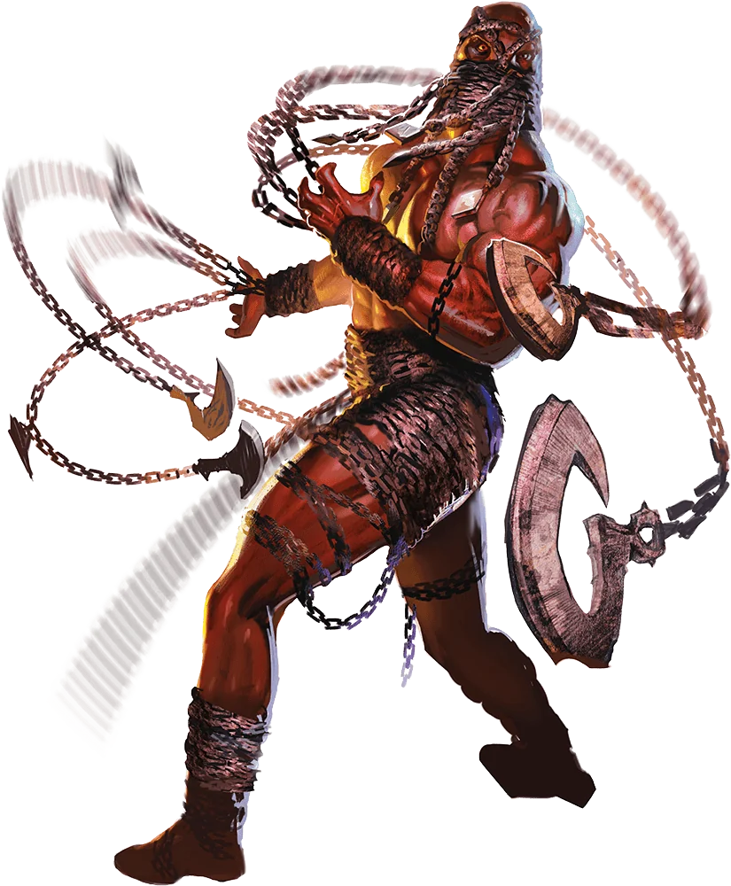 This ominous fiend wears chains like a shroud. Driving lesser creatures before it with its fearsome gaze, a chain devil animates the chains that cover its body as well as inanimate chains nearby, which sprout hooks, blades, and spikes to eviscerate enemies.
