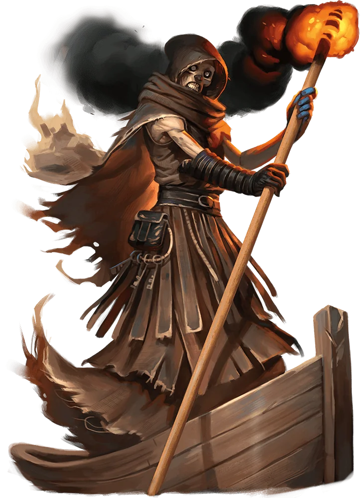 The grim captains of the ferries on the River Styx, merrenoloths can navigate safely through the worst storms and always stay on course. Wielding fiery oars, merrenoloths strike fear into anyone who forcefully boards their vessels.