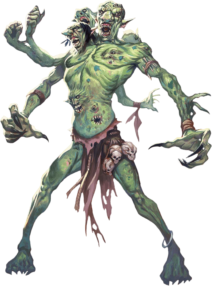 Dire trolls also increase their size by grafting flesh onto themselves. When a slab of quivering troll flesh is bound against a fresh wound on a dire troll, the dire troll’s regenerative capacity incorporates the new mass into the troll’s own musculature. Even more horrifying are the multiple arms, eyes, claws, and organs that dire trolls tear from their victims and graft onto themselves in this manner.