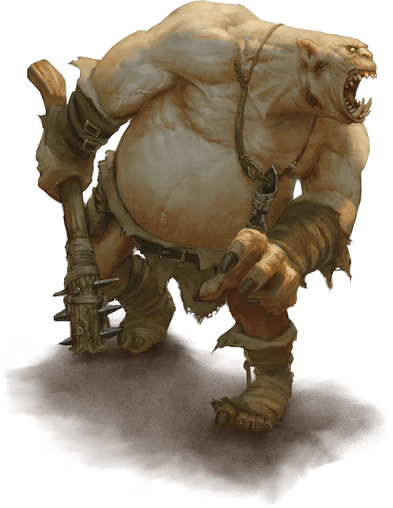 Ogres eat almost anything, but they especially enjoy the taste of dwarves, halflings, and elves. When they can, they combine dinner with pleasure, chasing scurrying victims around before eating them raw. If enough of its victim remains after the ogre has gorged itself, it might make a loincloth from its quarry’s skin and a necklace from its leftover bones. This macabre crafting is the height of ogre culture.