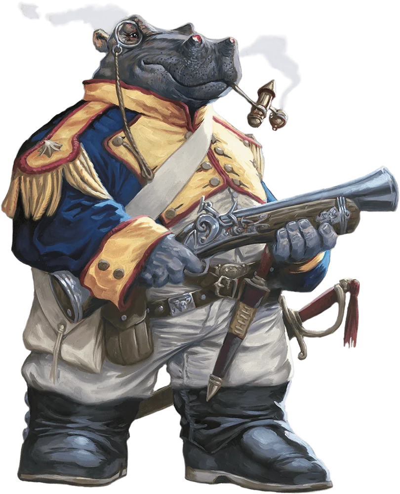 It’s easy to spot giff in a room: these burly folk are 7-foot-tall, hippopotamus-headed people. In Wildspace and the associated ports, giff are most often encountered as spacefaring mercenaries. These troops are renowned for their martial training and love of explosives and are typically armed with gleaming pistols and muskets. The stat block here represents one of those mercenaries.