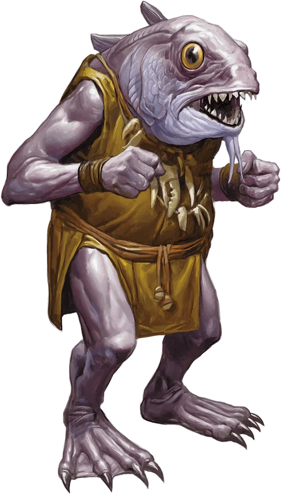 Kuo-toa are degenerate fishlike humanoids that once inhabited the shores and islands of the surface world. Long ago humans and their ilk drove the kuo-toa underground, where they dwell in madness and everlasting night. Kuo-toa can no longer abide daylight.