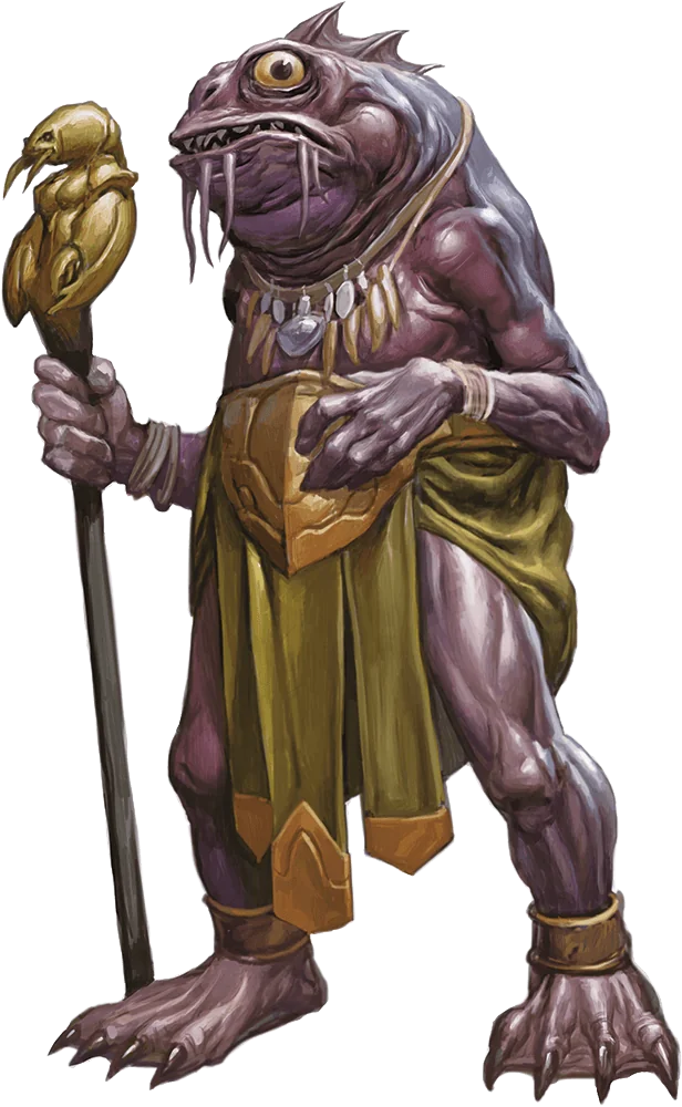 In general, kuo-toa don’t like the weight of armor on their slippery bodies and rely on their natural rubbery hides for protection. However, they like to wear jewelry made from scavenged bones, shells, pearls, gems, and carapace fragments.