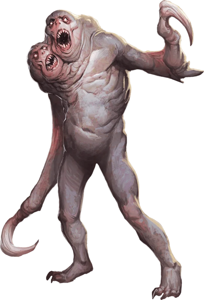 Relying on violence to sustain their existence, angry sorrowsworn—sometimes called the Angry—grow more powerful when their foes fight back. If a creature opts not to attack, though, this sorrowsworn becomes confused, and its attacks weaken. It also has two heads, which bicker with each other incessantly.