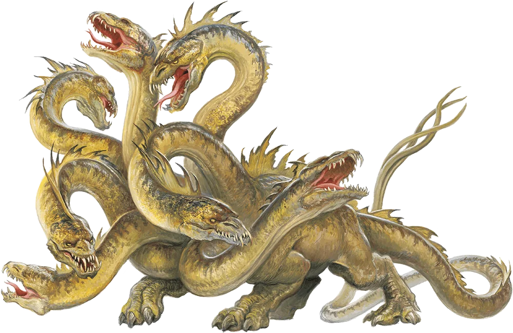 The hydra is a reptilian horror with a crocodilian body and multiple heads on long, serpentine necks. Although its heads can be severed, the hydra magically regrows them in short order. A typical specimen has five heads. At the dawn of time, Tiamat, the Queen of Evil Dragons, slew a rival dragon god named Lernaea and cast her blood across the multiverse. Each drop that fell upon a world spawned a multi-headed hydra consumed by a hunger as great as the fallen god’s hatred. Great champions are known to test their mettle against these fearsome creatures.