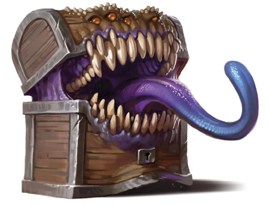 Mimics are shapeshifting predators able to take on the form of inanimate objects to lure creatures to their doom. In dungeons, these cunning creatures most often take the form of doors and chests, having learned that such forms attract a steady stream of prey.