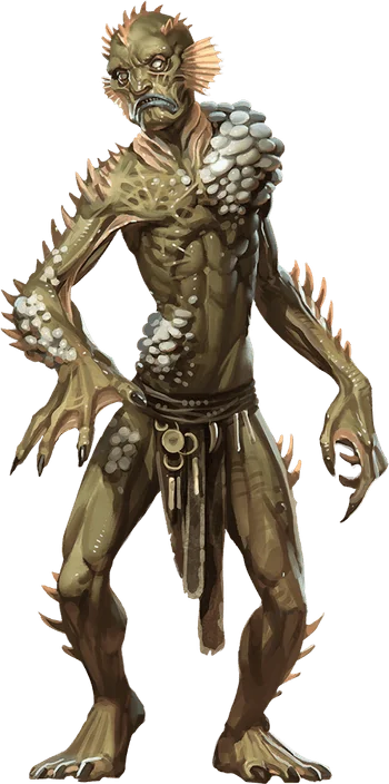 Krakens, morkoths, sea hags, marids, storm giants, dragon turtles—all of these and more can mark mortals as their own and claim them as minions. Unlucky folk might become beholden to such a master through a bleak bargain, or they might find themselves cursed by one. Once warped into a fishlike form, a sea spawn can’t leave the water for long without courting death.