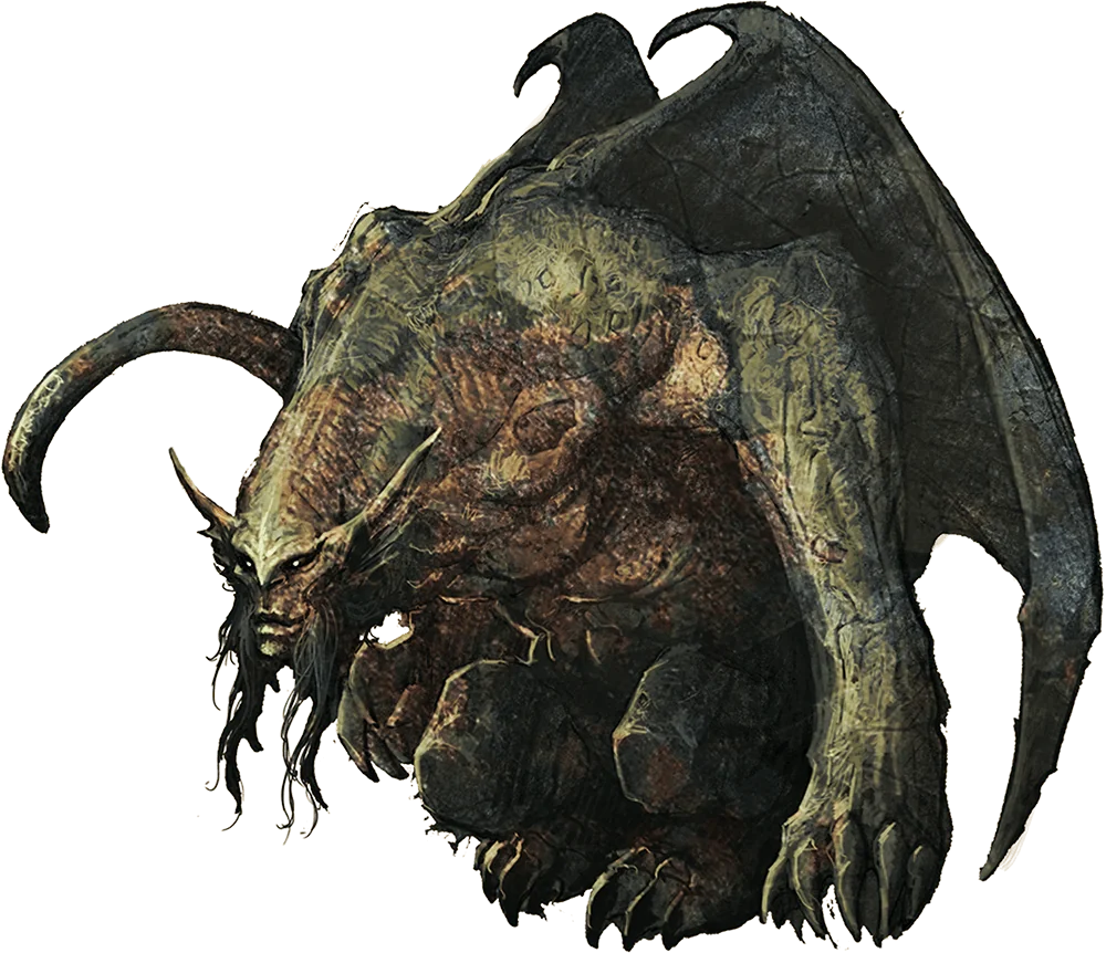 The Prince of Deception’s true form is like that of a great gargoyle, some 12 feet tall, with an extended, muscular neck; a smiling face framed by long, pointed ears and lank, dark hair; and bat-like wings are furled against his powerful shoulders. He can assume other forms, however, from the hideous to the beautiful.