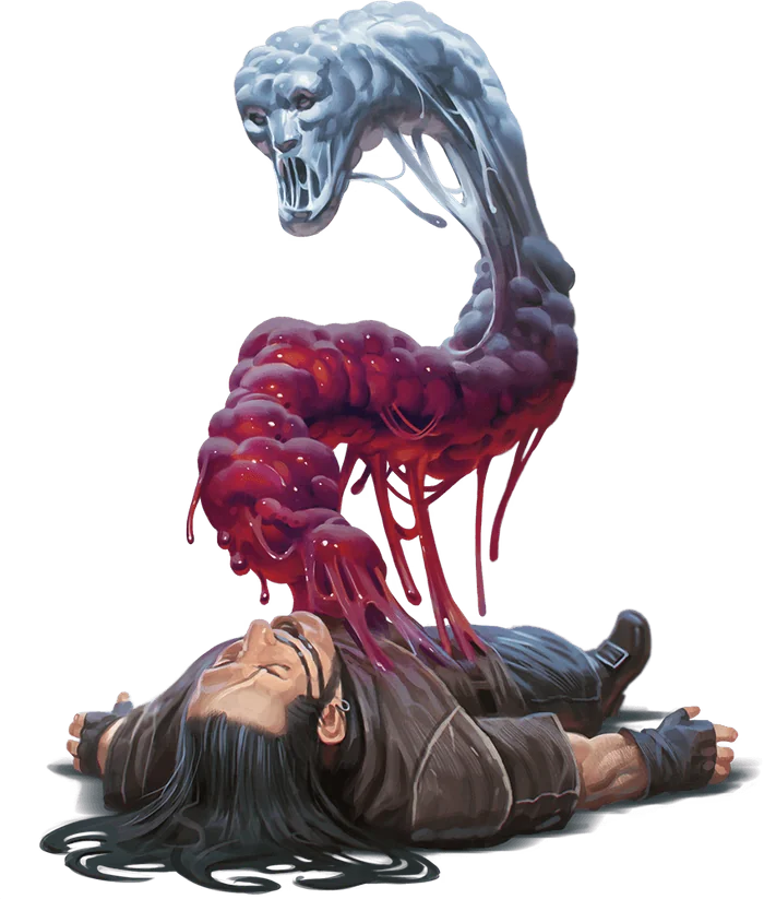 A slithering tracker tastes the ground it courses over, seeking any trace of its prey. To kill, a slithering tracker rises up and enshrouds a creature, attempting to drown the creature while also draining it of blood.