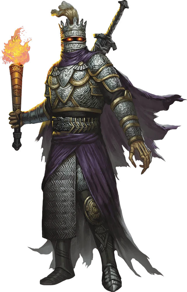 When a paladin that falls from grace dies without seeking atonement, dark powers can transform the once-mortal knight into a hateful undead creature. A death knight is a skeletal warrior clad in fearsome plate armor. Beneath its helmet, one can see the knight’s skull with malevolent pinpoints of light burning in its eye sockets.