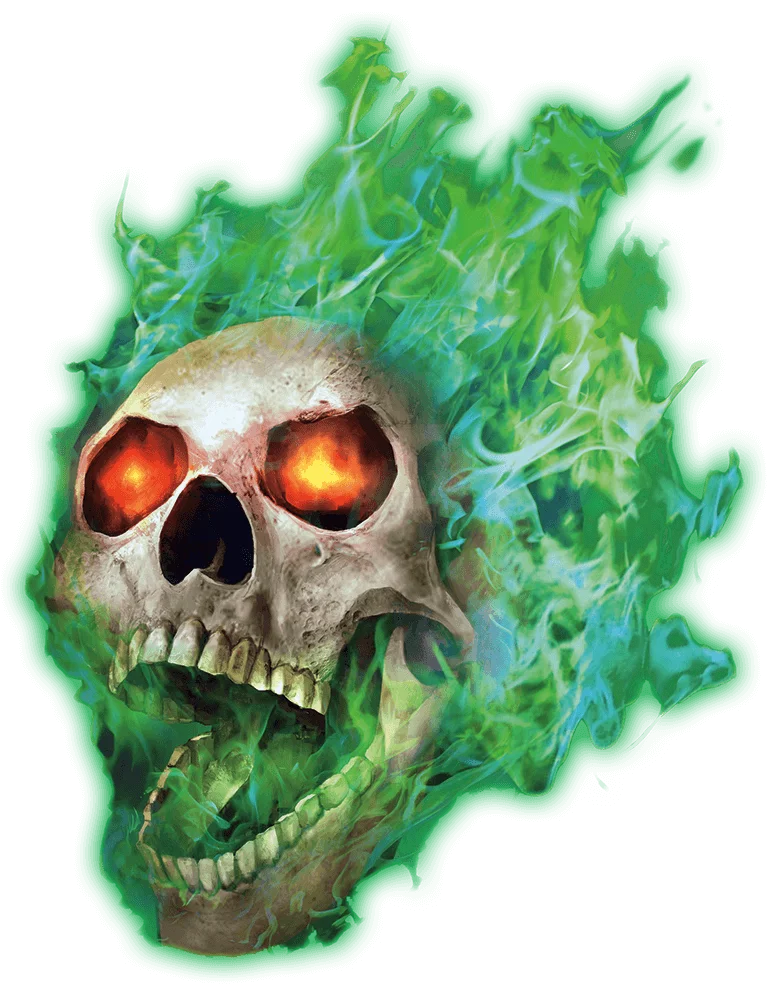 Blazing green flames and mad, echoing laughter follow a disembodied skull as it patrols its demesne. When the undead flameskull discovers trespassers, it blasts the intruders with fiery rays from its eyes and dreadful spells called up from the dark recesses of its memory.