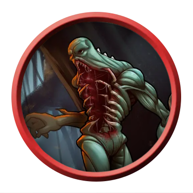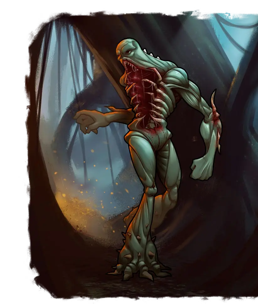 An unholy tangling of flesh, the gorger still vaguely resembles a humanoid in profile, except for the gaping, toothed maw in its chest. Its colossal teeth are little more than sharpened ribs, but its monstrous bite can easily decapitate.