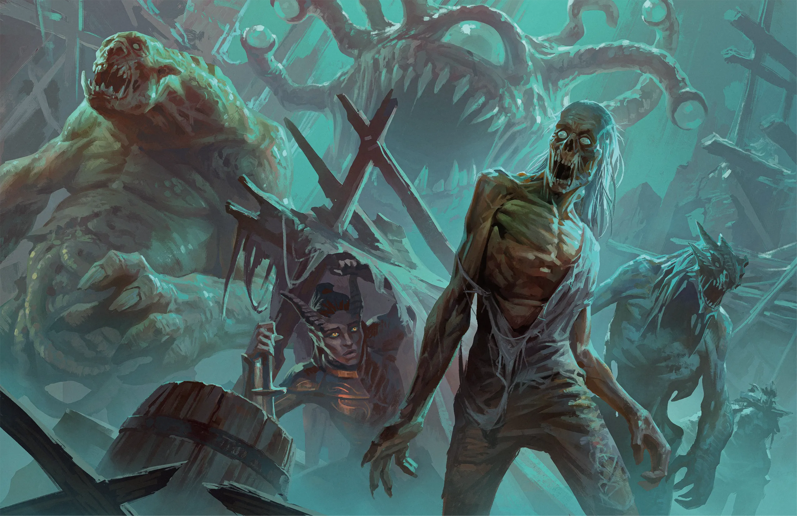 Zombies are unthinking, reanimated corpses, often gruesomely marred by decay and lethal traumas. They serve whatever supernatural force animates them—typically evil necromancers or fiendish spirits. Zombies are relentless, merciless, and resilient, and their dead flesh can carry on even after suffering grievous wounds. While they can follow simple orders, they rely on primal drives rather than thought. They fulfill commands by working tirelessly or battering through foes, but they are easily stymied by barriers or unexpected circumstances.
