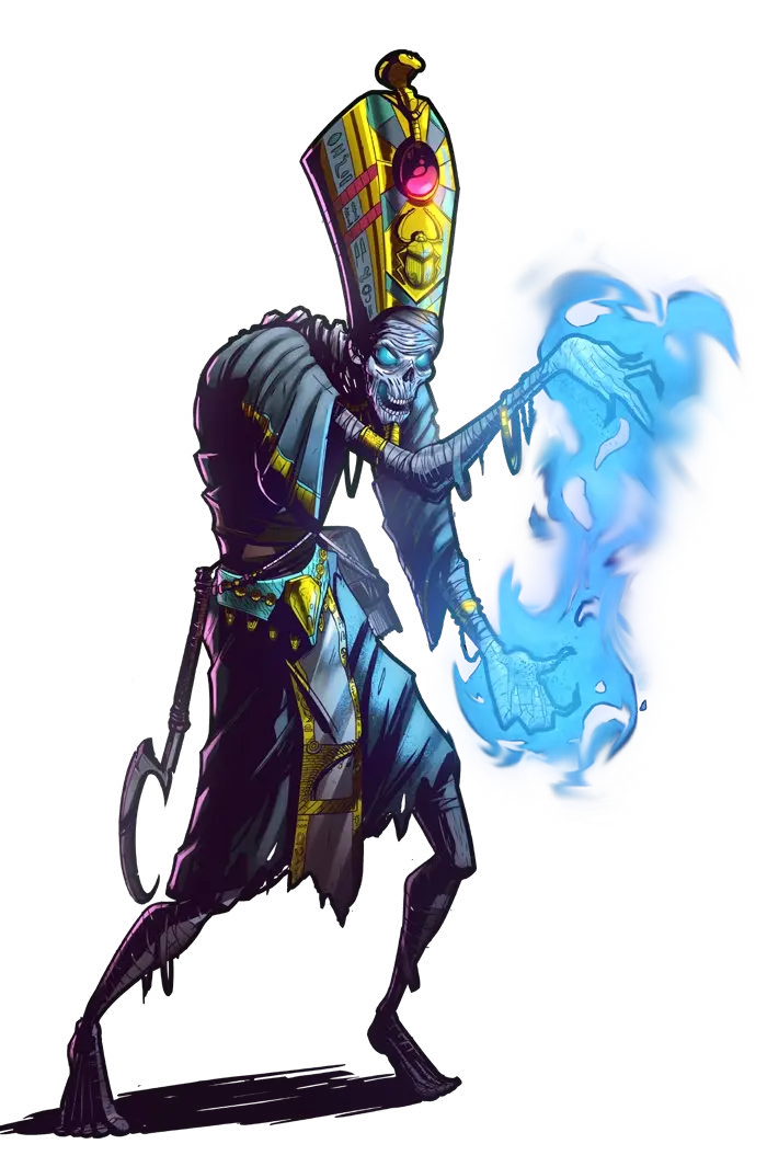 The godlike monarchs of ancient kingdoms practiced a unique style of Necromancy, forgotten to time. Through the extraction of organs, the desiccation of flesh, and innumerable enchantments, those ancient pharaohs were able to rule their subjects as divine, Undead beings, long past their mortal deaths. While those kingdoms have been lost to the shifting sands and wild jungles of the world, their methods have been preserved in the carvings of colossal temples and revived by modern Necromancers, who take on the guise of the erstwhile pharaohs. Their magic is a hybrid of divine and arcane influences, the legacy of deific monarchs from a forgotten age.