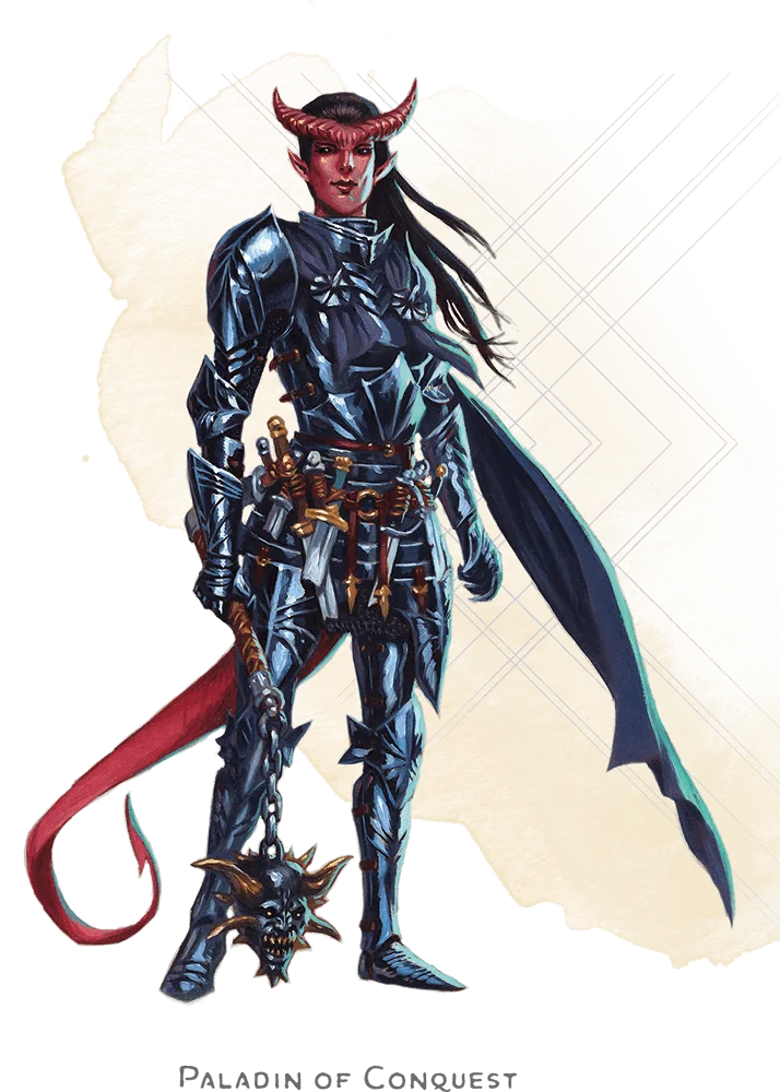 The Oath of Conquest calls to paladins who seek glory in battle and the subjugation of their enemies. It isn’t enough for these paladins to establish order. They must crush the forces of chaos. Sometimes called knight tyrants or iron mongers, those who swear this oath gather into grim orders that serve gods or philosophies of war and well-ordered might.