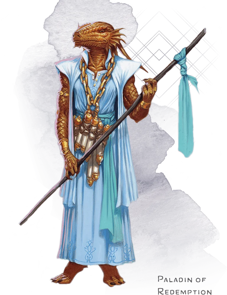 The Oath of Redemption sets a paladin on a difficult path, one that requires a holy warrior to use violence only as a last resort. Paladins who dedicate themselves to this oath believe that any person can be redeemed and that the path of benevolence and justice is one that anyone can walk. These paladins face evil creatures in the hope of turning their foes to the light, and they slay their enemies only when such a deed will clearly save other lives. Paladins who follow this path are known as redeemers.