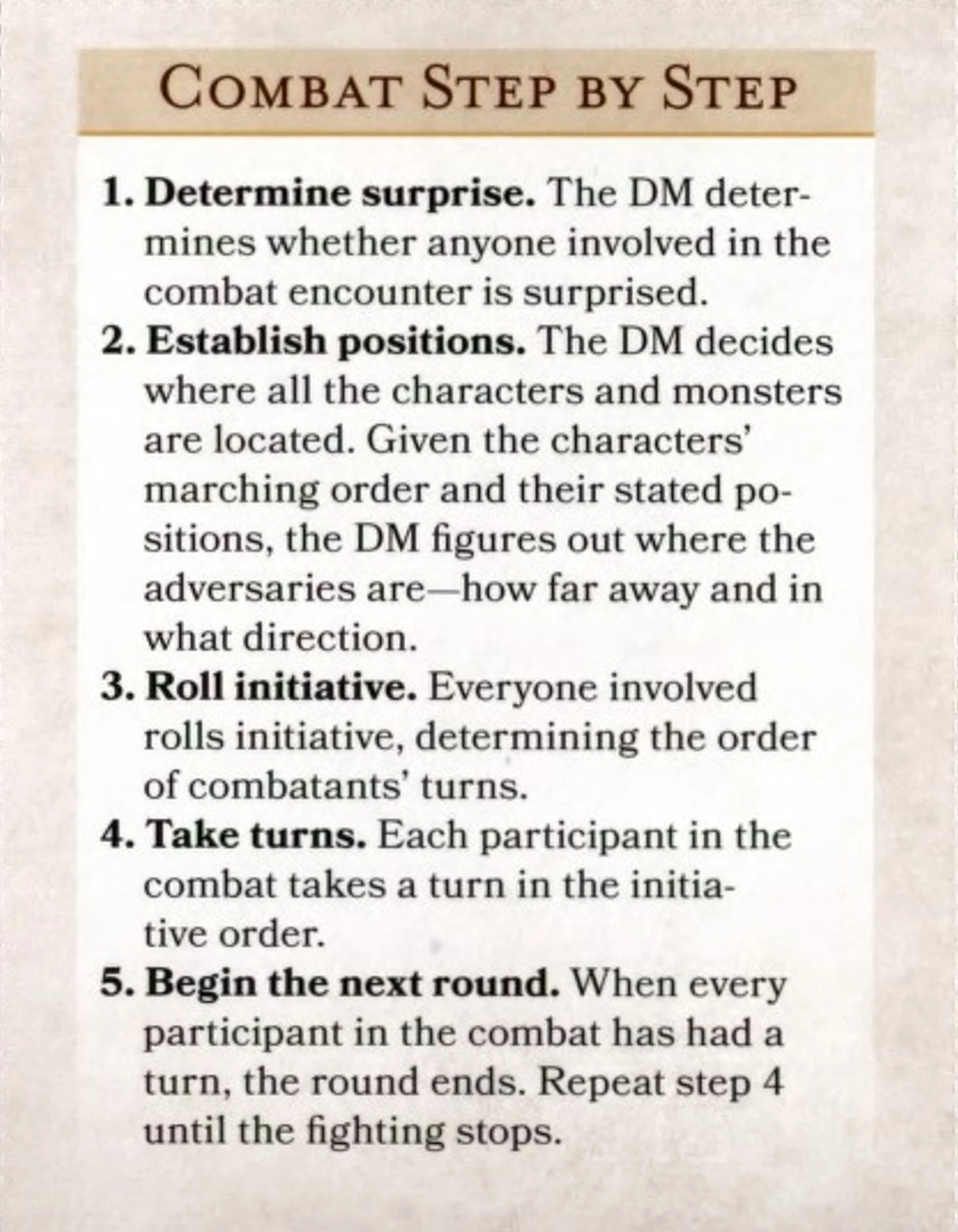 • Establish positions. The DM decides where all the characters and monsters are located. Given the character’s marching order and their stated positions, the DM figures out where the adversaries are—how far away and in what direction.