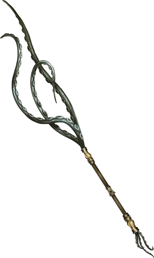 Made by the drow, this rod is a magic weapon that ends in three rubbery tentacles. While holding the rod, you can use an action to direct each tentacle to attack a creature you can see within 15 feet of you. Each tentacle makes a melee attack roll with a +9 bonus. On a hit, the tentacle deals 1d6 bludgeoning damage. If you hit a target with all three tentacles, it must make a DC 15 Constitution saving throw. On a failure, the creature’s speed is halved, it has disadvantage on Dexterity saving throws, and it can’t use reactions for 1 minute. Moreover, on each of its turns, it can take either an action or a bonus action, but not both. At the end of each of its turns, it can repeat the saving throw, ending the effect on itself on a success.