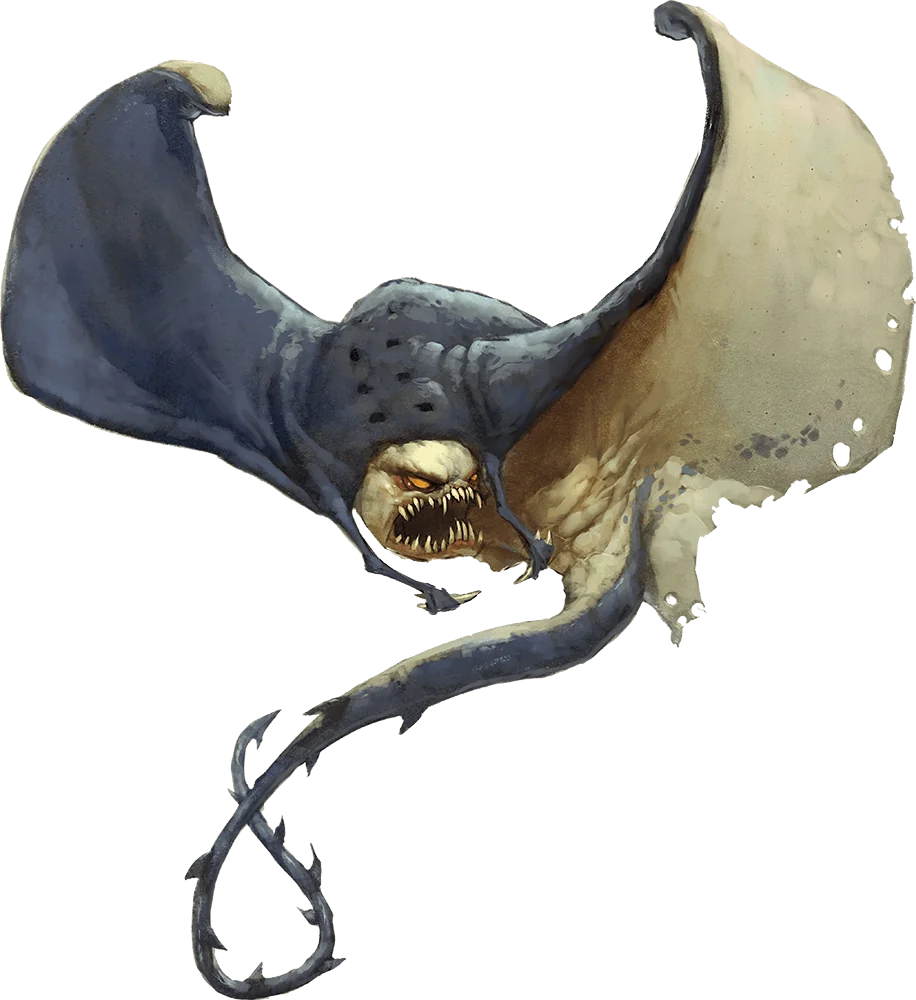 When a cloaker unfurls and moves to attack, it reveals its pale underside and makes its true nature evident. Red eyes glow above rows of sharp teeth, and a long pendulous tail whips behind it.