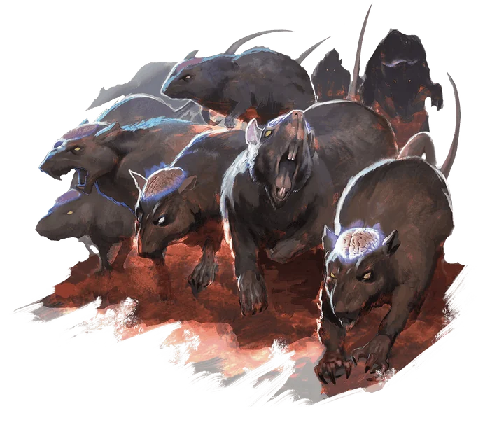 Mind flayers create cranium rats by bombarding rats with psionic energy. Cranium rats are somewhat smarter than ordinary rats and behave as such. If enough cranium rats come together to form a swarm, they merge their minds into a single intelligence with the accumulated memories of all the swarm’s constituents. The rats become smarter as a result, and retain their heightened intelligence for as long as the swarm persists. The swarm also awakens latent psionic abilities implanted within each cranium rat by its mind flayer creators, bestowing upon the swarm psionic powers.