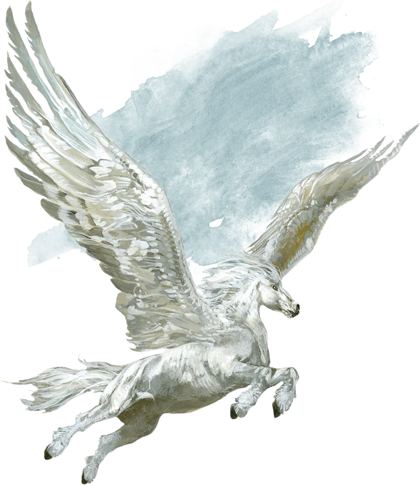 Pegasi trace their origins to the Olympian Glades of Arborea, where they soar through the skies of that plane and serve as faithful mounts to the Seldarine, the pantheon of elven gods. These gods have been known to send pegasi to the Material Plane to aid those in need.