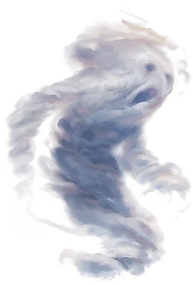An air elemental is a funneling cloud of whirling air with a vague semblance of a face. Although it likes to race across the ground, picking up dust and debris as it goes, it can also fly and attack from above.