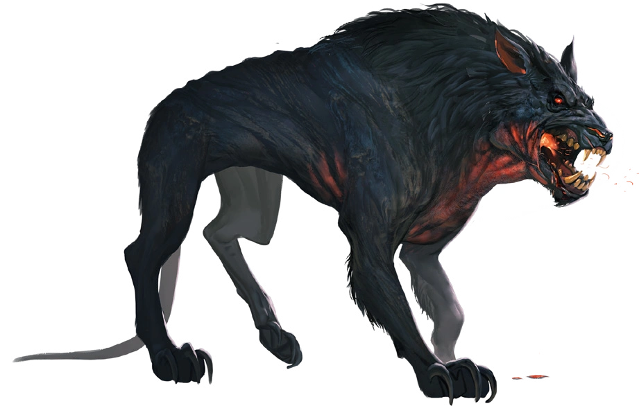 Monstrous, fire-breathing fiends that take the form of powerful dogs, hell hounds are found on the battlefields of Acheron and throughout the Lower Planes. On the Material Plane, hell hounds are most commonly seen in service to devils, fire giants, and other evil creatures that use them as guard animals and companions.