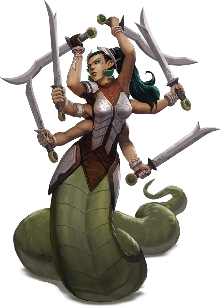 Terrible to behold, a marilith has the lower body of a great serpent and the upper torso of a humanoid female with six arms. Wielding a wicked blade in each of its six hands, a marilith is a devastating foe that few can match in battle.