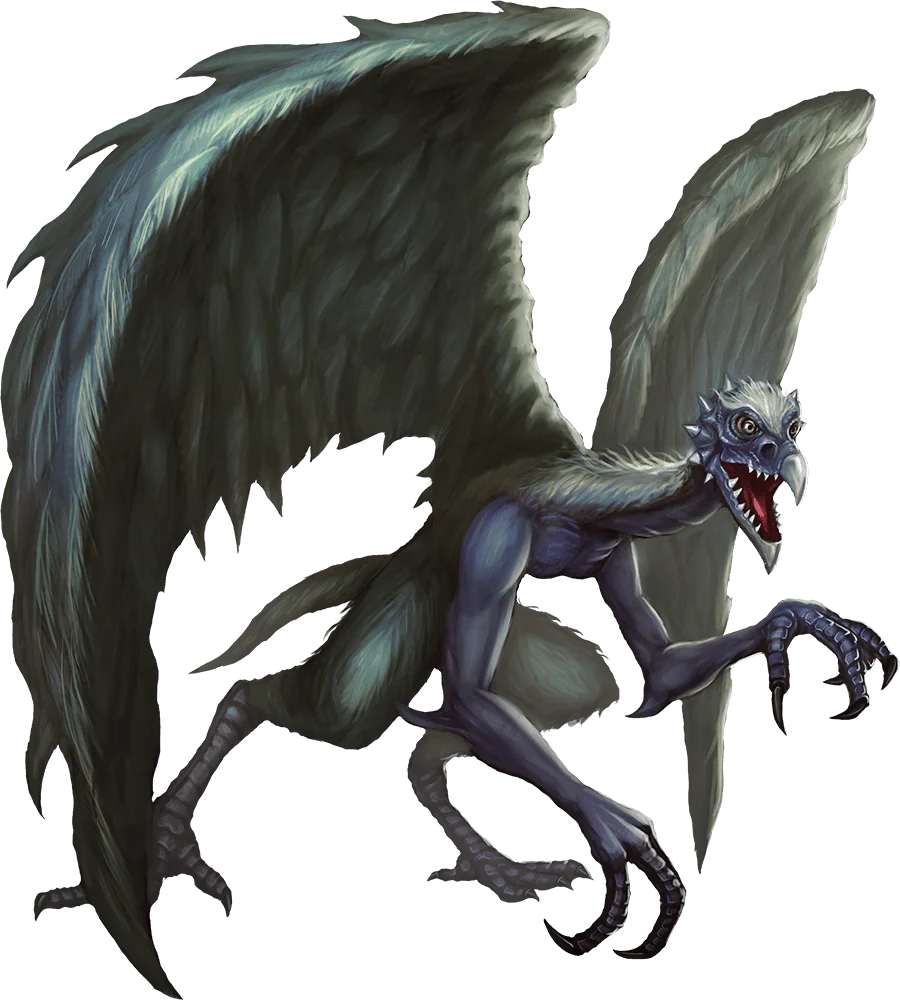 Vrocks are dull-witted, capricious fiends that live only to create pain and carnage. A vrock resembles a giant hybrid of humanoid and vulture, its gnarled, bestial body and broad wings stinking of offal.