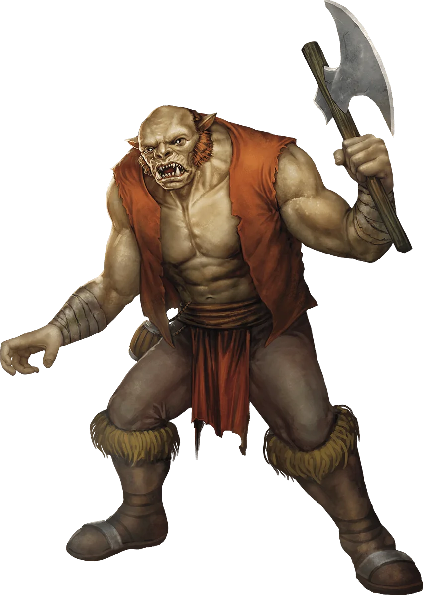 When an ogre mates with a human, hobgoblin, bugbear, or orc, the result is always a half-ogre. (Ogres don’t mate with dwarves, halflings, or elves. They eat them.) Human mothers rarely survive the birth of a half-ogre offspring.