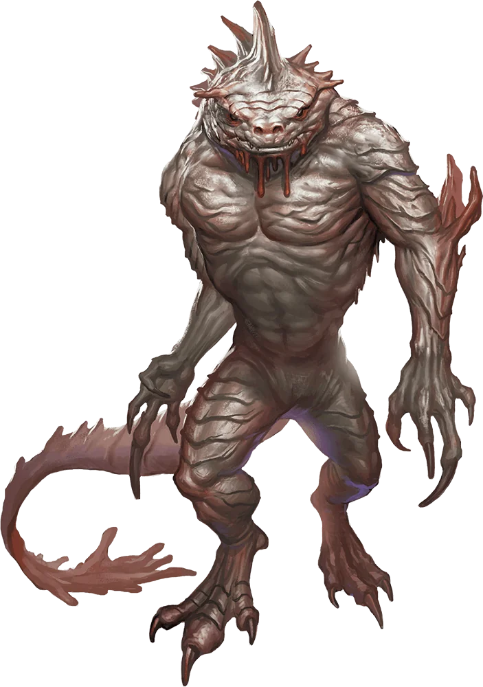 Perhaps the most loathsome of all humanoids, troglodytes eat anything they can stomach. They dwell in filth. The walls of their cavern homes are smeared with grime, oily secretions, and the debris of their foul feasting.