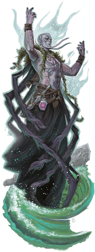 Every kraken priest undergoes a change in appearance that reflects the kraken’s influence, although each one differs in how their reverence is displayed. One kraken priest might have ink-black eyes and a suckered tentacle for a tongue, while another has a featureless face and a body covered in eyes and mouths that dribble seawater. These horrific manifestations intensify when the kraken possesses its minion to utter dire pronouncements.