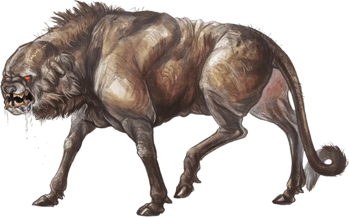 A leucrotta is so loathsome that few outside of its own kind can stand to be around one for long. Its horrific, hodgepodge body oozes a foul stench. This reek is outdone only by the creature’s breath, which issues from a maw that drips fluid corrupted with rot and digestive juices. In place of fangs, a leucrotta has bony ridges as hard as steel that can crush bones and lacerate flesh. These plates are so tough that a leucrotta can use them to peel plate armor away from the body of a slain knight.