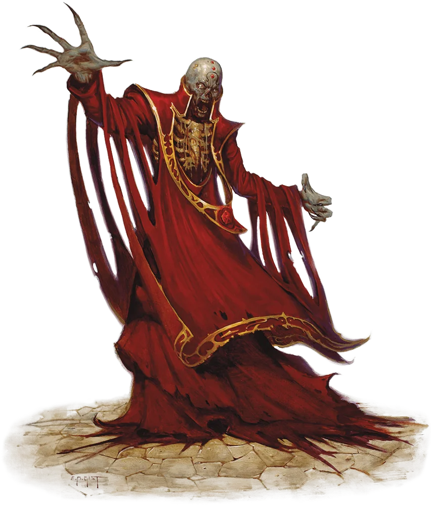 A lich is a gaunt and skeletal humanoid with withered flesh stretched tight across its bones. Its eyes succumbed to decay long ago, but points of light burn in its empty sockets. It is often garbed in the moldering remains of fine clothing and jewelry worn and dulled by the passage of time.