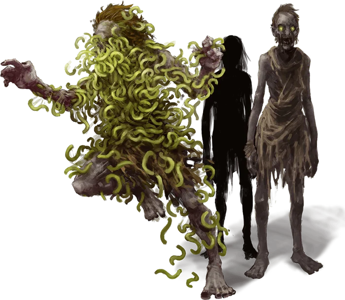 From a distance or in poor light, a spawn of Kyuss looks like an ordinary zombie. As it comes into clearer view, however, the scores of little green worms crawling in and out of it become visible. These worms jump onto nearby Humanoids and burrow into their flesh. A worm that penetrates a Humanoid body makes its way to the creature’s brain. Once inside the brain, the worm kills its host and animates the corpse, transforming it into a spawn of Kyuss, which breeds more worms.