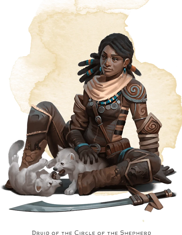 Druids of the Circle of the Shepherd commune with the spirits of nature, especially the spirits of beasts and the fey, and call to those spirits for aid. These druids recognize that all living things play a role in the natural world, yet they focus on protecting animals and fey creatures that have difficulty defending themselves. Shepherds, as they are known, see such creatures as their charges. They ward off monsters that threaten them, rebuke hunters who kill more prey than necessary, and prevent civilization from encroaching on rare animal habitats and on sites sacred to the fey. Many of these druids are happiest far from cities and towns, content to spend their days in the company of animals and the fey creatures of the wilds.