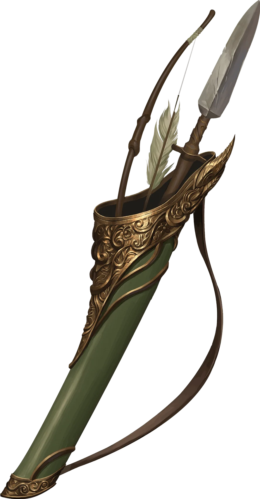 Each of the quiver’s three compartments connects to an extradimensional space that allows the quiver to hold numerous items while never weighing more than 2 pounds. The shortest compartment can hold up to sixty arrows, bolts, or similar objects. The midsize compartment holds up to eighteen javelins or similar objects. The longest compartment holds up to six long objects, such as bows, quarterstaffs, or spears.