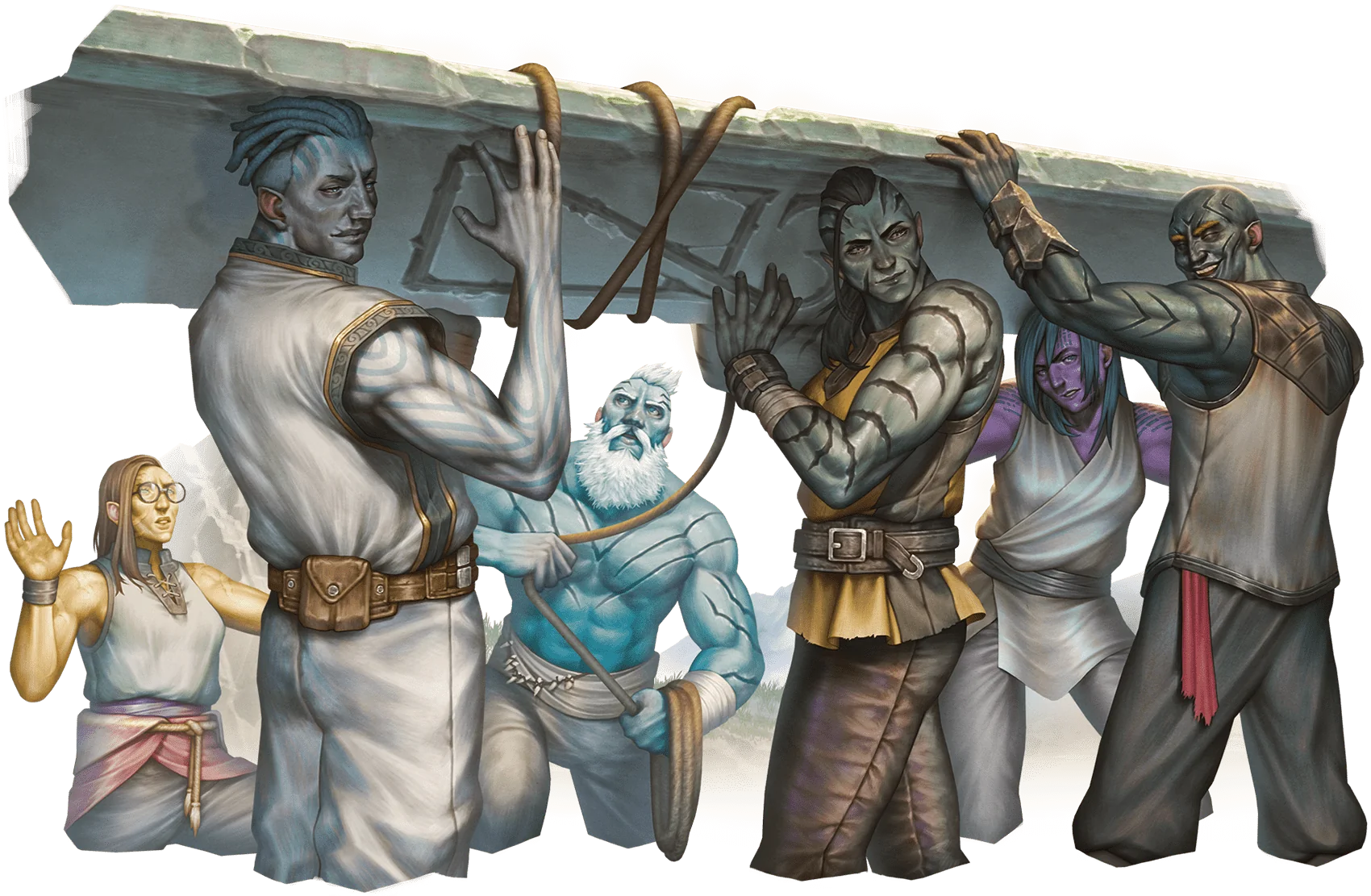 Goliaths have physical characteristics that are reminiscent of the giants in their family lines. For example, some goliaths look like stone giants, while others resemble fire giants. Whatever giants they count as kin, goliaths have forged their own path in the multiverse—unencumbered by the internecine conflicts that have ravaged giantkind for ages—and seek heights above those reached by their ancestors.